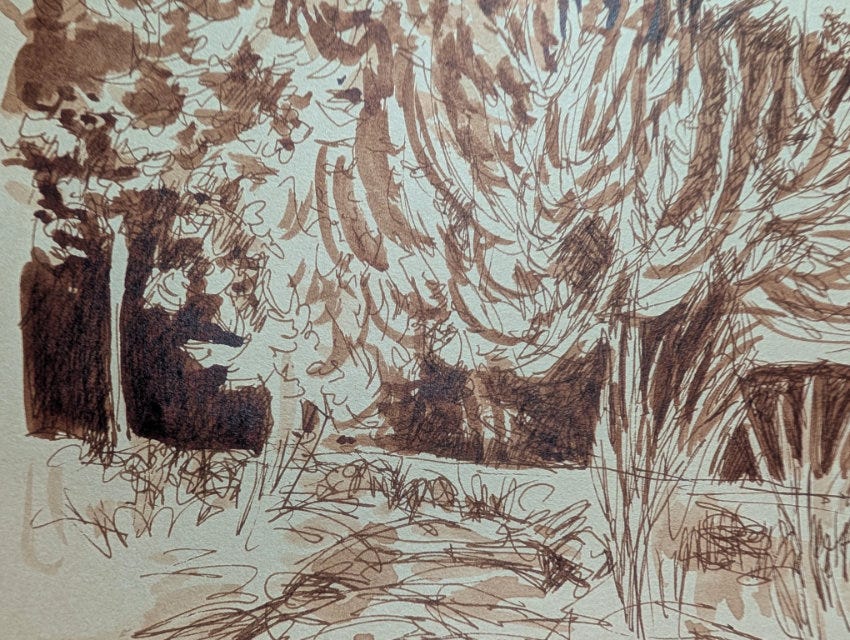 Here’s a page from my larger, 11” x 14” sketchbook with beige paper — a fast ink and wash drawing of olive trees glimpsed from the side of the road while driving in Sicily. What was helpful for me was drawing with energy and speed. I obliterated this initial drawing, unsuccessfully, with some watercolor and gouache later on, so I was glad I’d taken a quick picture of it before that. Life is like this, I think — we try things, some succeed, some don’t, and sometimes we make an utter mess of things, but then we have to turn the page and start again, confident that something better lies ahead and that we can learn from what has gone before.